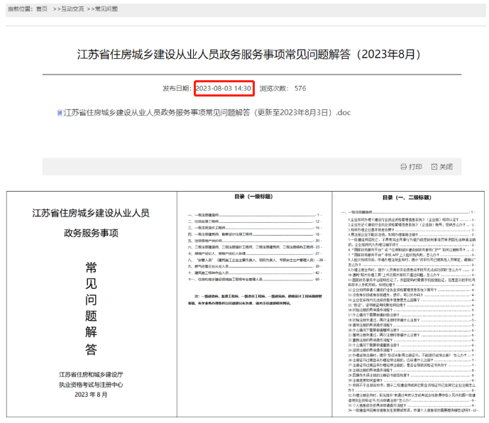 8月3日,江苏省住建厅发布《江苏省住房城乡建设从业人员政务服务事项常见问题解答》(2023年8月),其中包含一建、监理、二建、“八大员”等人员常见问题解答,共208个问题解答。