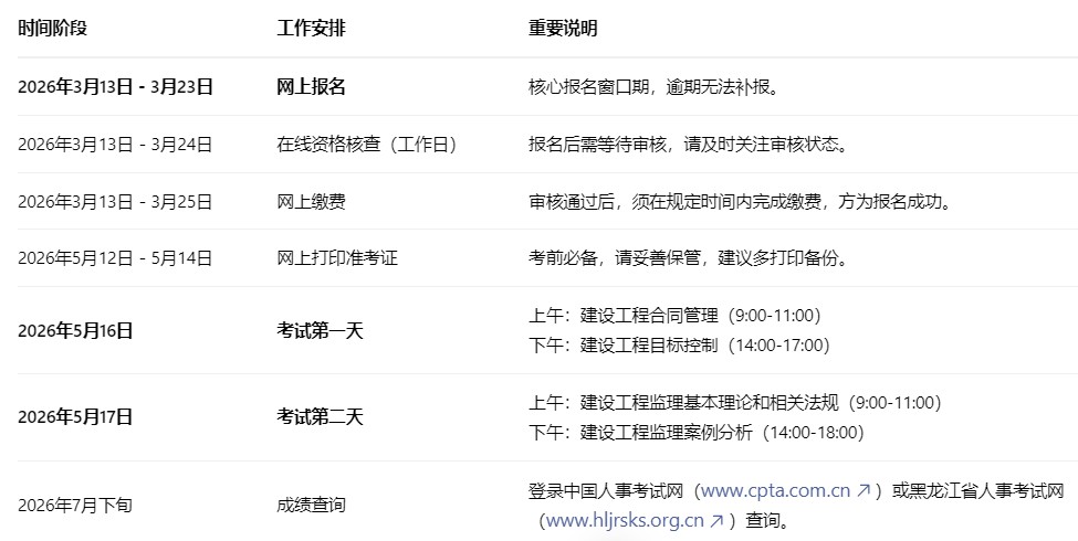 黑龙江省2026年度监理工程师职业资格考试报名工作即将启动。本文为您带来最权威、最详细的考务信息,核心内容包括:黑龙江注册监理工程师报名时间(2026年3月13日至3月23日)、在线资格核查、缴费、准考证打印及考试时间等全流程安排,并附上备考建议,助您顺利报考,高效复习。
