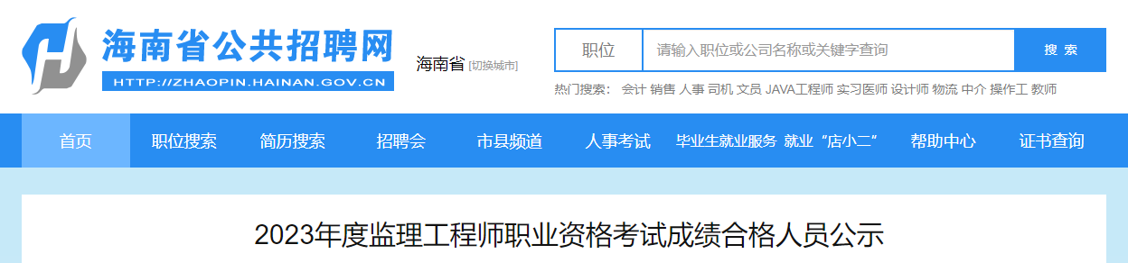 7月27日,海南省公共招聘网发布了“2023年度监理工程师职业资格考试成绩合格人员公示”,公示期为2023年7月27日至2023年8月5日。