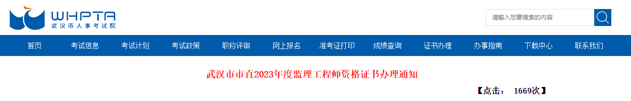 武汉市人事考试院发布了“武汉市市直2023年度监理工程师资格证书办理通知”,办证对象为准考证或中国人事考试网下载的成绩单上报名地市为“湖北省武汉市”的考生。