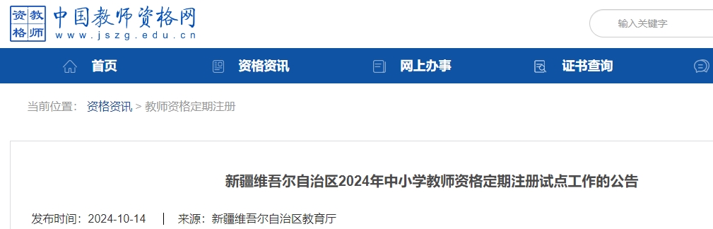10月14日,新疆维吾尔自治区教育厅发布了《新疆维吾尔自治区2024年中小学教师资格定期注册试点工作的公告》,当中明确了2024年新疆维吾尔自治区中小学教师资格定期注册工作时间为10月14日-12月16日。