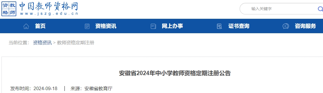 9月18日,安徽省教育厅发布了《安徽省2024年中小学教师资格定期注册公告》,当中明确了安徽省2024年中小学教师资格定期注册本人网上申请、学校审查等环节的具体时间,由各市、省直管县(市)教师资格注册机构根据当地工作实际安排,于注册工作启动前一周通过教育局官网向社会公布。