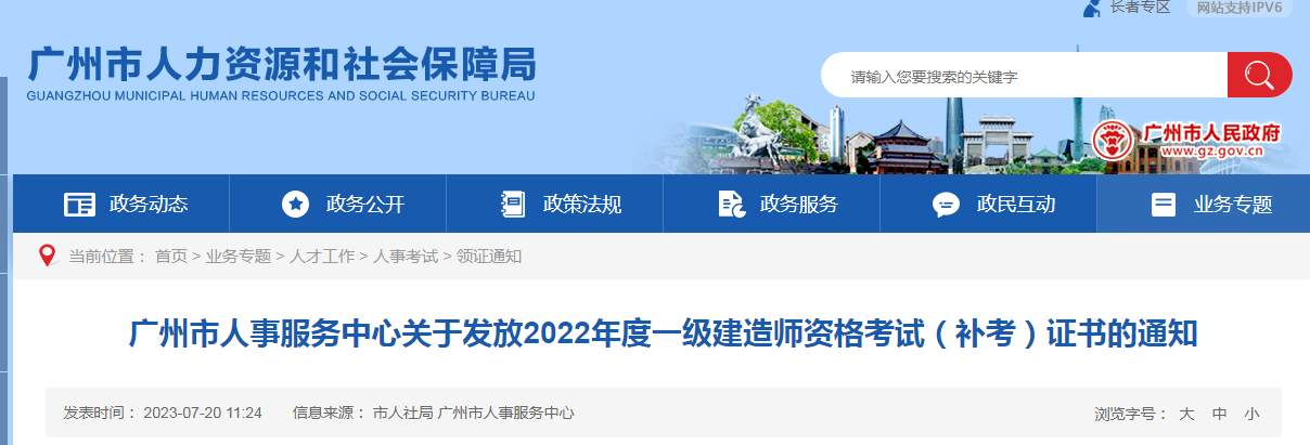 近日,广州市人力资源和社会保障局发布了《关于发放2022年度一级建造师资格考试(补考)证书的通知》,通知中对2022年广东广州市一级建造师资格考试补考证书发放的相关事宜进行了具体说明。