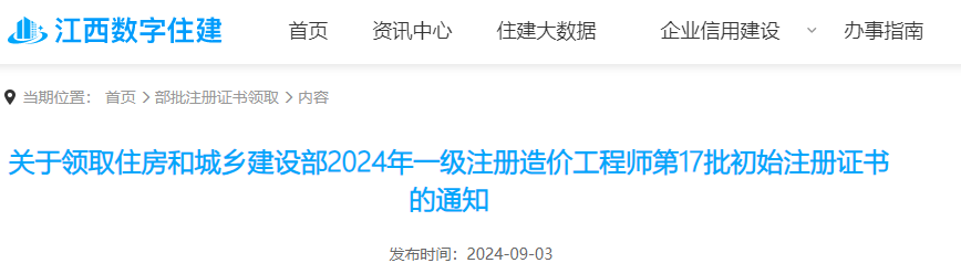 2024年9月3日,江西数字住建网发布了《关于领取住房和城乡建设部2024年一级注册造价工程师第17批初始注册证书的通知》,其中明确江西一级造价师初始注册证书已办结,相关人员需进行现场或邮寄办理。