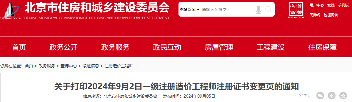 2024年9月5日,北京市住房和城乡建设委员会发布了《关于打印2024年9月2日一级注册造价工程师注册证书变更页的通知》,其中明确北京市一级造价师变更注册已完成,相关人员可至北京市政务服务中心打印变更页。