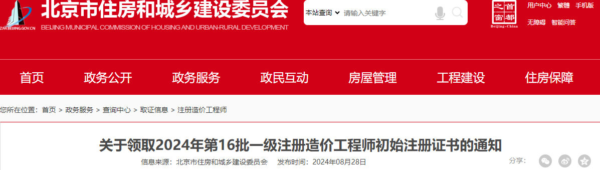 2024年8月28日,北京市住房和城乡建设委员会发布了《关于领取2024年第16批一级注册造价工程师初始注册证书的通知》,其中明确北京一级造价师初始注册已办结,相关人员需至北京市政务服务中心领取。