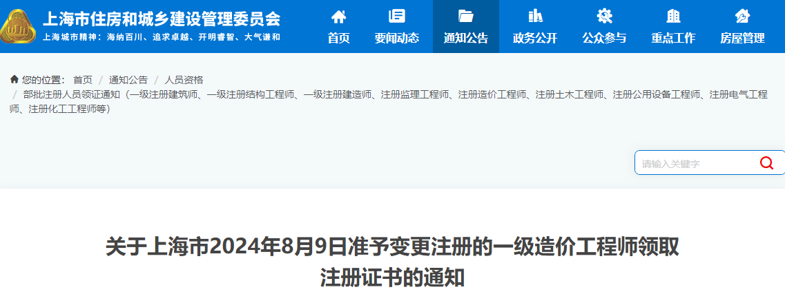 上海市2024年8月9日准予变更注册的一级造价工程师注册证书领取通知原文如下: