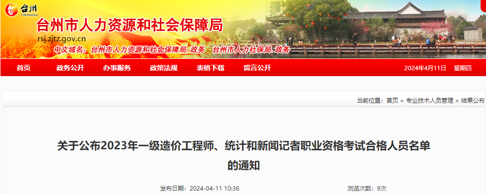 2024年4月11日,台州市人力资源和社会保障局发布了《关于公布2023年一级造价工程师、统计和新闻记者职业资格考试合格人员名单的通知》,其中明确2023年度台州一级造价师各科目合格标准为总分的60%,相关人员可下载电子证书或申请证书邮寄。
