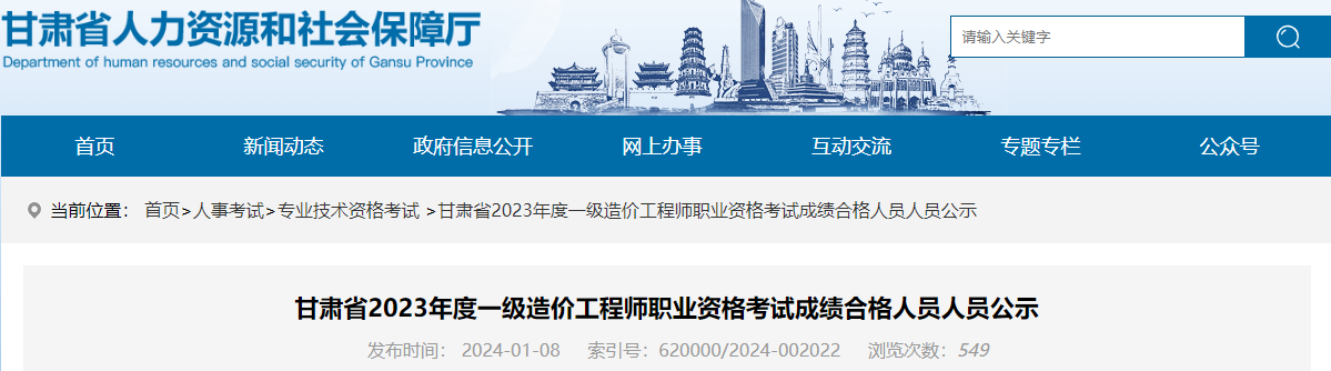 2024年1月8日,甘肃省人力资源和社会保障厅发布了《甘肃省2023年度一级造价工程师职业资格考试成绩合格人员公示》,其中明确甘肃省共有795人取得一级造价师合格成绩,相关人员信息于1月8日开始公示。