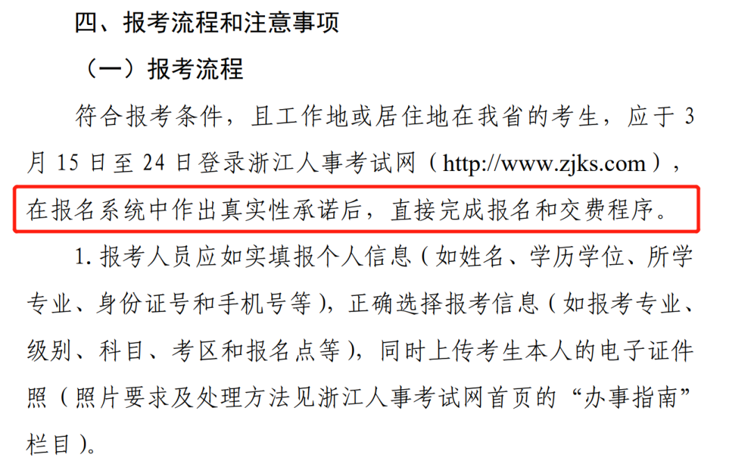 符合报考条件,且工作地或居住地在我省的考生,应于 3 月 15 日至 24 日登录浙江人事考试网(http://www.zjks.com), 在报名系统中作出真实性承诺后,直接完成报名和交费程序。