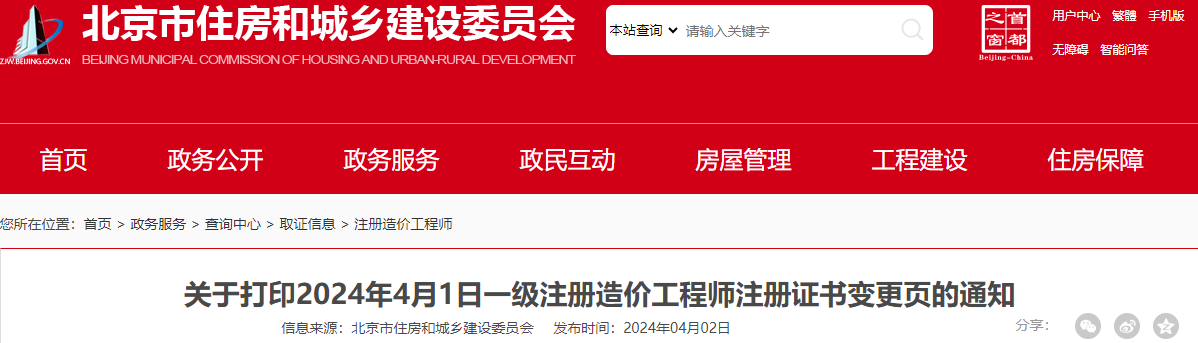 2024年4月2日,北京市住房和城乡建设委发布了《关于打印2024年4月1日一级注册造价工程师注册证书变更页的通知》,其中明确申请一级造价师变更注册人员需打印变更页,打印地址为北京市政务服务中心。
