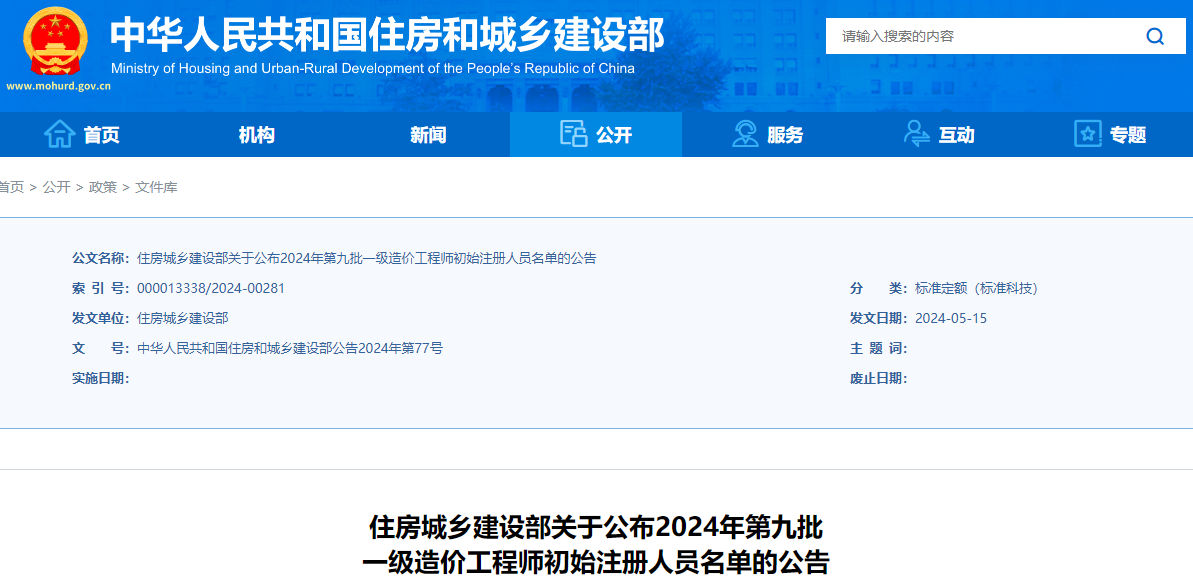 2024年5月20日,中华人民共和国住房和城乡建设部发布了《关于公布2024年第九批一级造价工程师初始注册人员名单的公告》,其中明确共有5751人符合一级造价师初始注册条件,准予注册。
