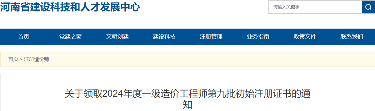 2024年6月3日,河南省建设科技和人才发展中心发布了《关于领取2024年度一级造价工程师第九批初始注册证书的通知》,其中明确河南省一级造价师第九批初始注册证书已办结,考生需携带相关证件领取。