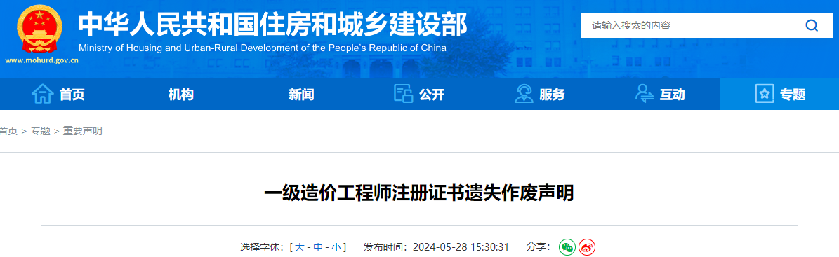 2024年5月28日,中华人民共和国住房和城乡建设部发布了《一级造价工程师注册证书遗失作废声明》,其中明确共有155人遗失一级造价师注册证书作废,并对信息予以公布。