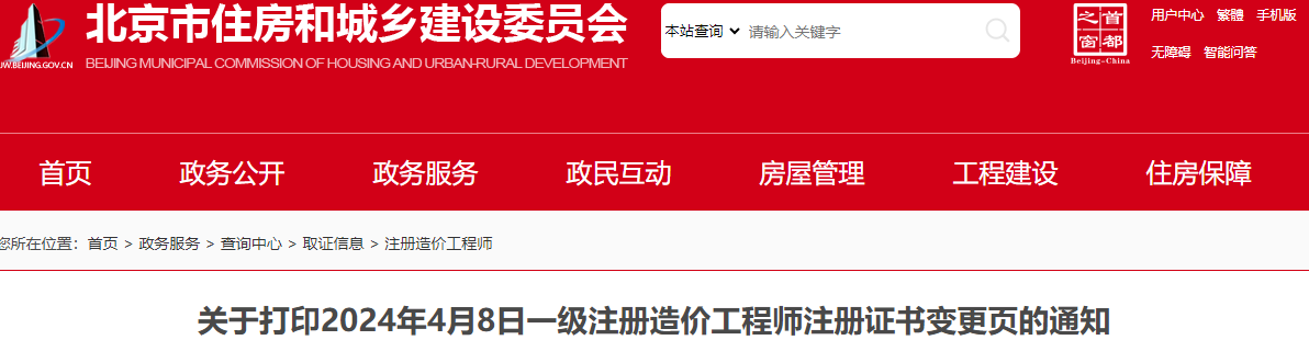 2024年4月9日,北京市住房和城乡建设委员会发布了《关于打印2024年4月8日一级注册造价工程师注册证书变更页的通知》,其中明确北京市一级造价师变更注册申请人员需至北京市政务服务中心打印变更页,并对领取方式、注意事项等作出具体说明。