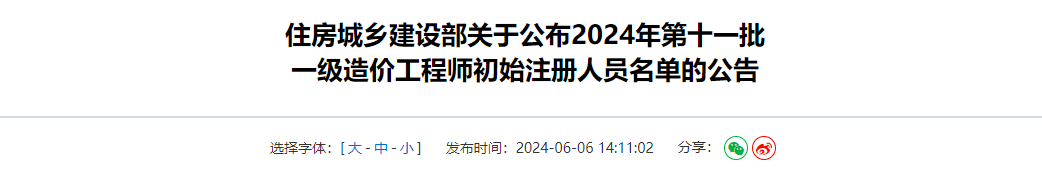 2024年6月6日,中华人民共和国住房和城乡建设部发布了《关于公布2024年第十一批一级造价工程师初始注册人员名单的公告》,其中明确共有6721人符合一级造价师初始注册条件,并对相关人员信息予以公示。