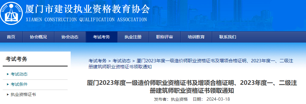 厦门2023年度一级造价师职业资格证书及增项合格证明、2023年度一、二级注册建筑师职业资格证书于2024年03月18日起开始发放;考生领取方式如下:
