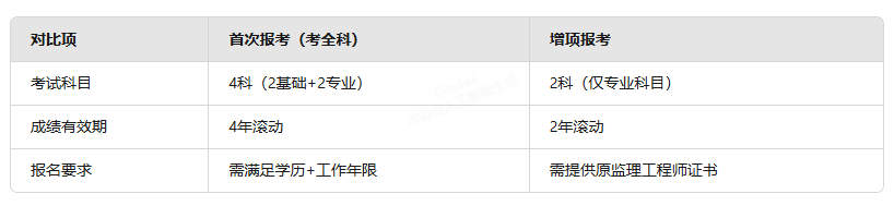国家注册监理工程师增项考试需考2门专业科目,分别为《建设工程目标控制》和《建设工程监理案例分析》,免考《建设工程监理基本理论和相关法规》《建设工程合同管理》2门基础科目。考生可从土木建筑工程、交通运输工程、水利工程3个专业中选择新增专业,成绩实行2年为一个周期的滚动管理。