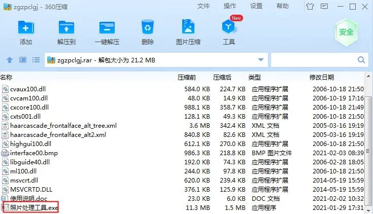 解压压缩包后打开文件找到照片处理工具.exe(如下图)。