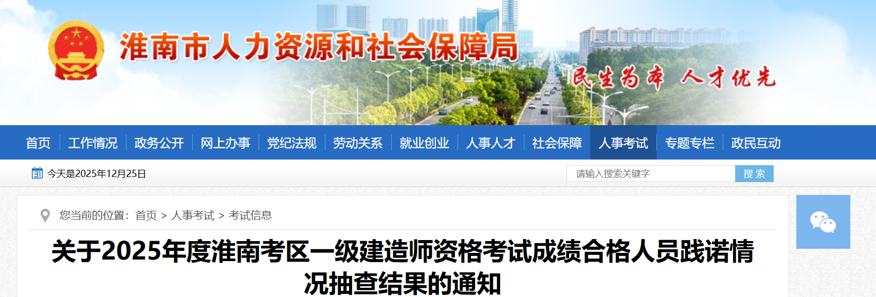 为切实加强事中事后监管,确保告知承诺制试点工作顺利推进,根据省人力资源和社会保障厅《关于专业技术人员资格考试告知承诺制试点工作有关事宜的通知》(皖人社秘〔2020〕41号)以及资格考试报名证明事项告知承诺制有关要求,我市对2025年度淮南考区一级建造师资格考试成绩合格人员报考资格条件进行随机抽查,抽查人员名单见附件。