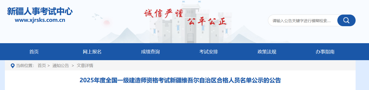根据《人力资源社会保障部人事考试中心关于印发<专业技术人员职业资格考试报名证明事项告知承诺制工作规程>的通知》(人考中心函〔2021〕1号)要求,现将2025年度全国一级建造师资格考试新疆维吾尔自治区合格人员名单予以公示,共计2286人(名单附后)。