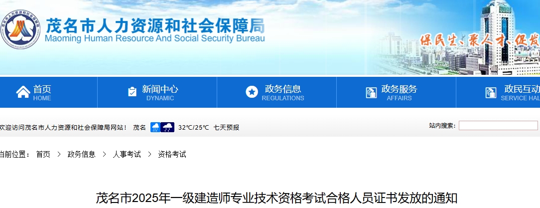 1月21日,茂名市人力资源和社会保障局发布《茂名市2025年一级建造师专业技术资格考试合格人员证书发放的通知》,明确广东茂名市2025年一级建造师专业技术资格考试合格人员证书定于1月21日起开始发放。