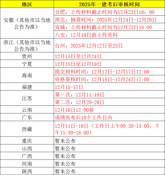 2025年一级建造师考试实行考后审核的地区有:浙江、广东、山西、重庆、江苏、安徽、广西、海南、福建、河南、云南、西藏、陕西、宁夏、贵州。
