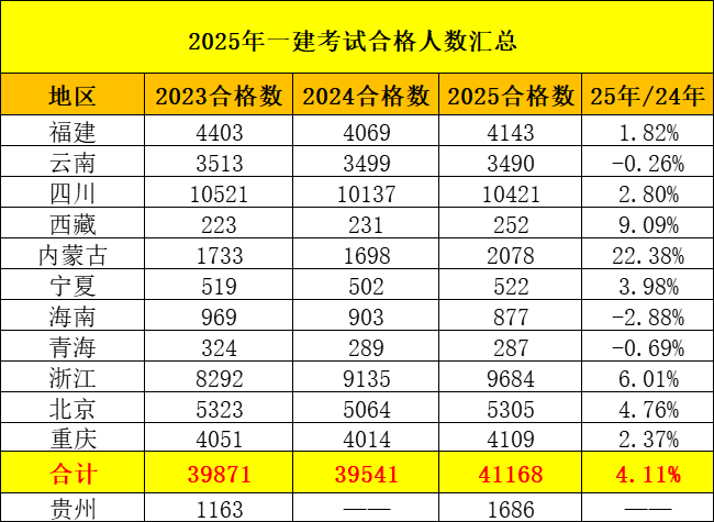 各地2025年一级建造师考试合格人员名单陆续公布,根据已经公布的11个地区统计来看,总共有41168人合格,相比去年增加了4.11%(增加了1627人),具体如下: