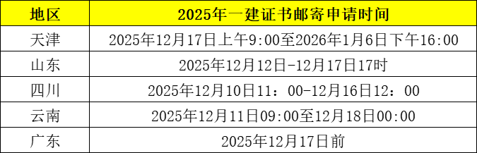 广东、云南、四川、山东、天津等地已开通2025年一级建造师证书直邮服务,申请时间如下: