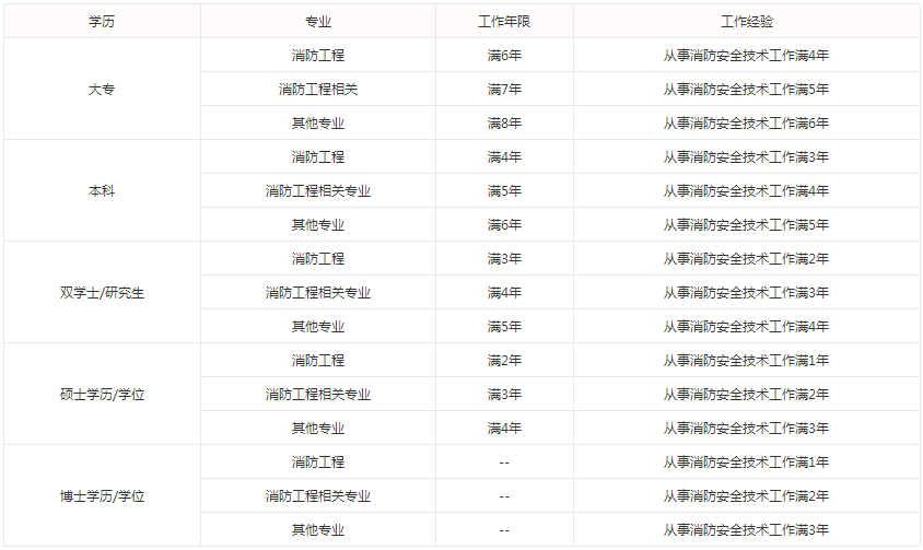 1、取得消防工程专业(或相关专业)大学专科学历,工作满6年(7年),当中从事消防安全技术工作满4年(5年);