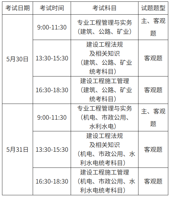 考试按《专业工程管理与实务》科目专业类别分2天2批次实施,具体考试时间、科目和题型见表格。