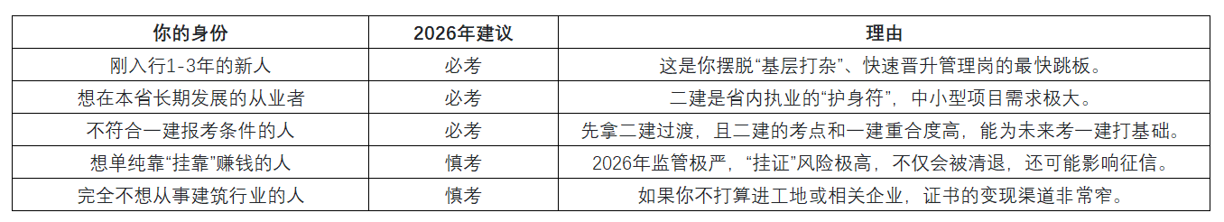 简单来说:二建的作用依然很大,它是建筑行业的“入场券”和“晋升器”。 对于符合条件的人来说,2026年绝对是考证的黄金窗口期。