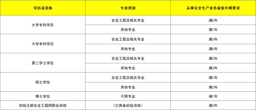 1.具有安全工程及相关专业大学专科学历,从事安全生产业务满5年;或具有其他专业大学专科学历,从事安全生产业务满7年。