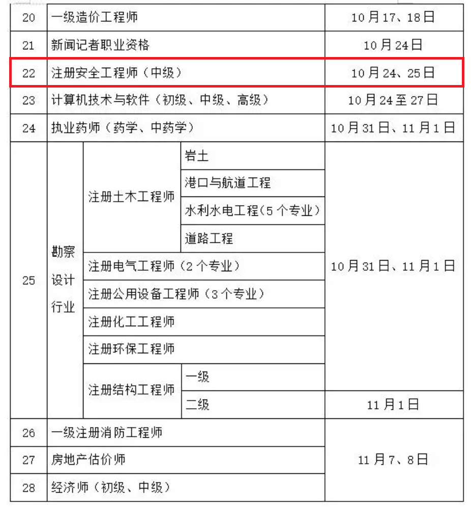 根据海南省人力资源开发局发布的《海南省2026年职业资格考试工作安排表》,2026年海南中级注册安全工程师考试时间确定为10月24日至25日。该计划共涵盖28个大类的职业资格考试,多数考试报名通知将于考前3个月发布。