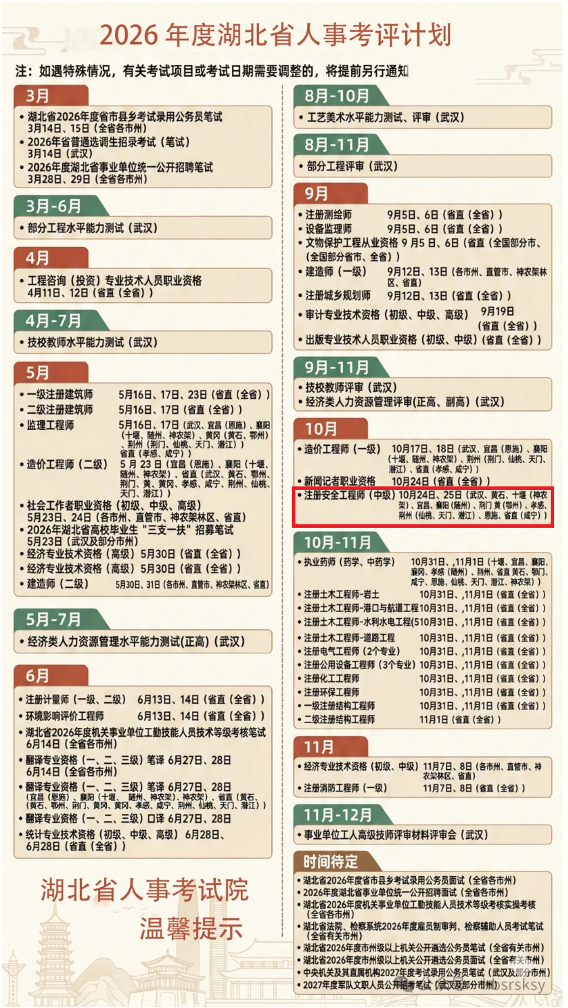 近日,湖北省人事考试院正式发布《2026年度湖北省人事考评日历》,明确2026年湖北中级注册安全工程师职业资格考试定于10月24日至25日举行。本次考试在全省设置12个考区,方便考生就近参考。以下为考务安排详情及报考要点解析。