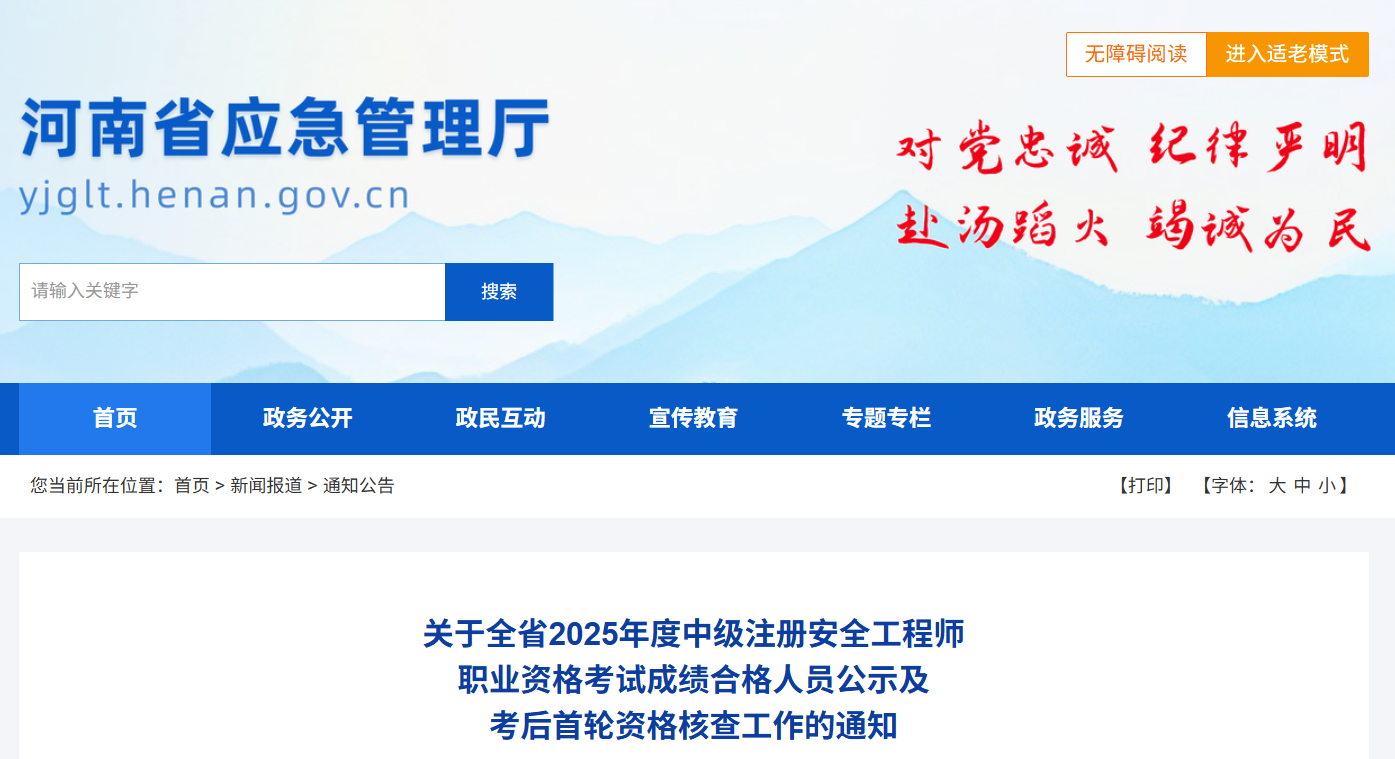 根据《专业技术人员职业资格考试考务工作规程》《专业技术人员职业资格考试报名证明事项告知承诺制工作规程》,现对河南省2025年度中级注册安全工程师职业资格考试4701名成绩合格人员予以公示,及考后首轮资格核查有关事项通知如下。