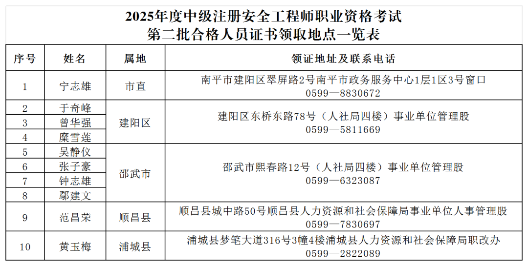 2025年南平市中级注安师第二批合格证书已可领取。市属单位人员可前往南平市政务服务中心现场领取,或登录市人社局网站扫描二维码申请邮寄(邮费自理)。各县(市、区)合格人员请按属地原则至当地人社局领取,具体地址详见附件。