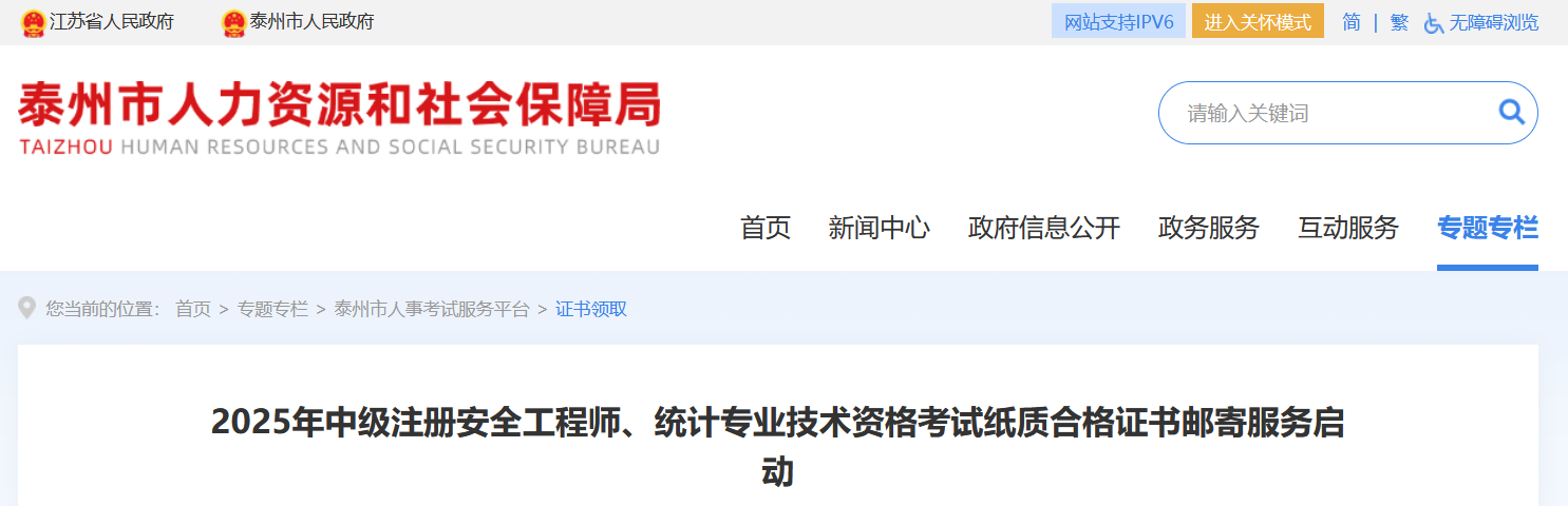 2025年中级注册安全工程师、统计专业技术资格考试电子证书已陆续在中国人事考试网“证书查询验证”板块公布,目前,泰州市纸质合格证书已到。电子证书与纸质证书同等效力,如需纸质证书,请阅读《免费邮寄资格证书服务指南》(https://rsj.taizhou.gov.cn/ztzl/tzsrsksfwpt/zslq/art/2025/art_b95c477a65f34c8c977787e0d435efdf.html),我们将免费邮寄。