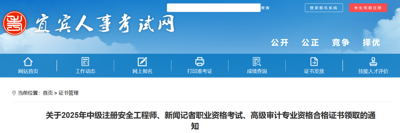 2025年宜宾市中级注安师、新闻记者及高级审计证书已发放。考生须持本人身份证或社保卡原件(代领需双方证件)至市人事考试中心(翠屏区大碑巷37号)领取,时间为工作日9:00-12:00、13:30-17:00。
