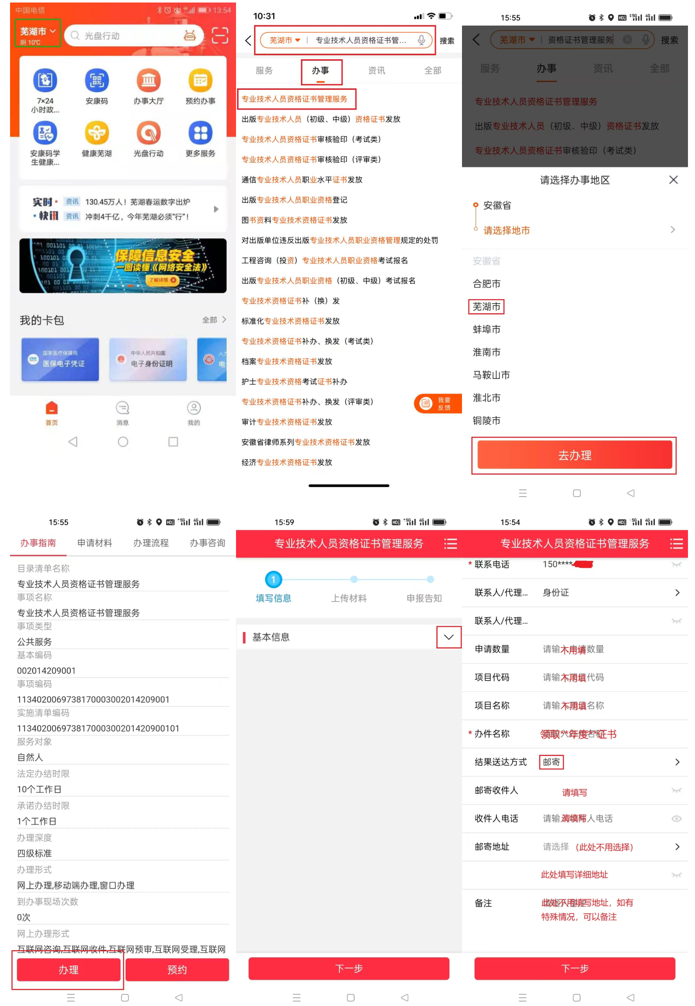 邮寄方式:方式1:移动端申请(推荐使用),手机下载皖事通APP,城市选择芜湖,搜索栏搜索“专业技术人员资格证书管理服务”,在线办理。