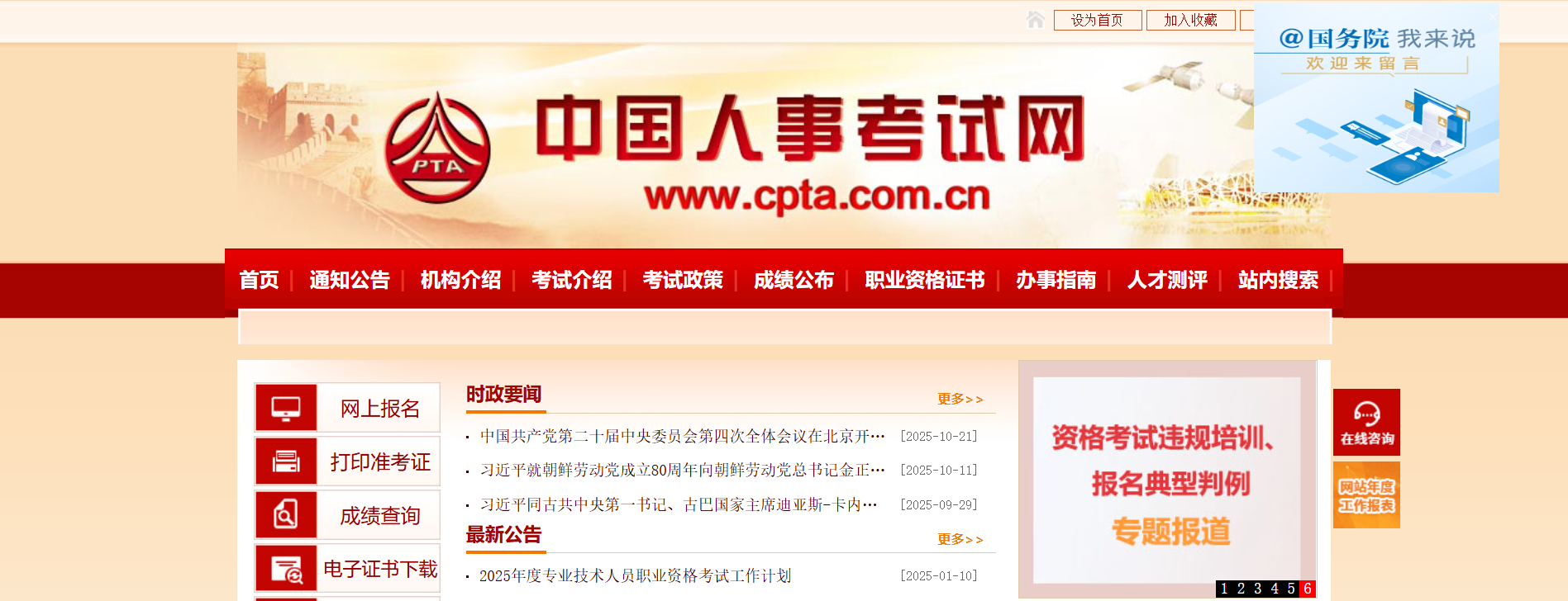 在规定时间内,进入中国人事考试网(http://www.cpta.com.cn/),注意使用IE浏览器(10以上的版本)、谷歌浏览器或360浏览器的极速模式、搜狗浏览器的高速模式。