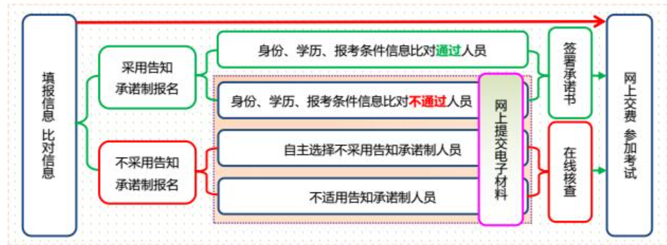 采用告知承诺制,若身份、学历、报考条件信息在线核验都通过的人员,可直接签署承诺书,缴费,完成报名。报名期间无须进行资格审核。若身份、学历、报考条件信息在线核验有不通过的人员,需要按照当地要求进行人工审核,审核通过再缴费。