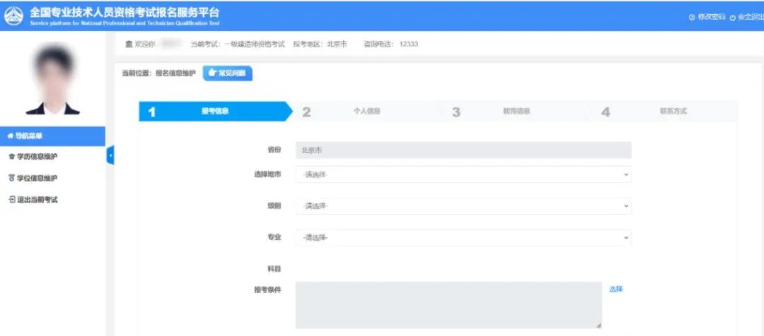 添加学历信息,完善工作经历,完善联系方式。待到“账号信息完整度”为100%时才可进入考试报名。