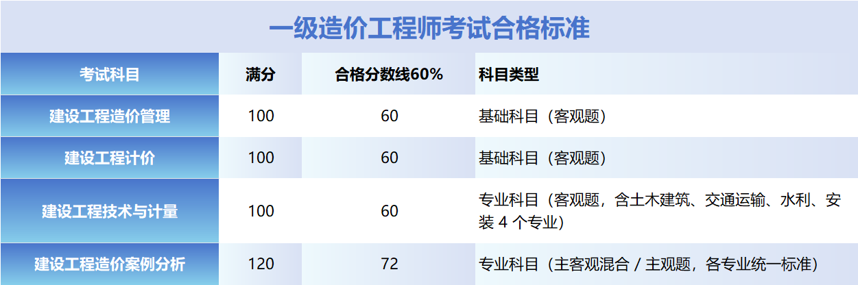根据人力资源和社会保障部规定,2025年一级造价师各科合格标准均为卷面总分的60%,具体如下: