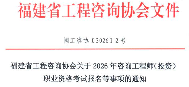 根据中国工程咨询协会、人力资源和社会保障部人事考试中心《关于做好2026年度咨询工程师(投资)职业资格考试考务工作的通知》(中咨协资信[2026]3号)文件精神,经商福建省人事考试中心,现将我省2026年咨询工程师(投资)职业资格考试有关事项通知如下:
