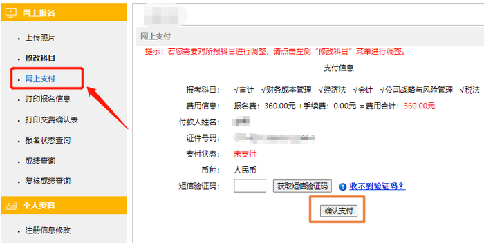 第三步:网上支付。完成科目的调整及确认后,进行交费。