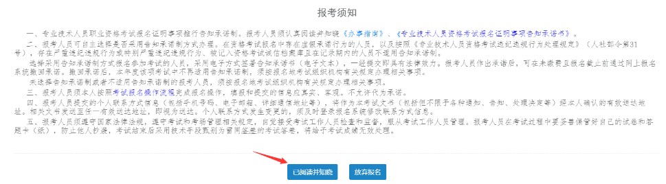 仔细阅读《专业技术人员资格考试报名证明事项告知承诺制报考承诺书》,勾选【我已阅知并知晓】后进入下一步。强烈建议选择“采用告知承诺制”方式,可免去现场提交纸质证明,全程在线办理。