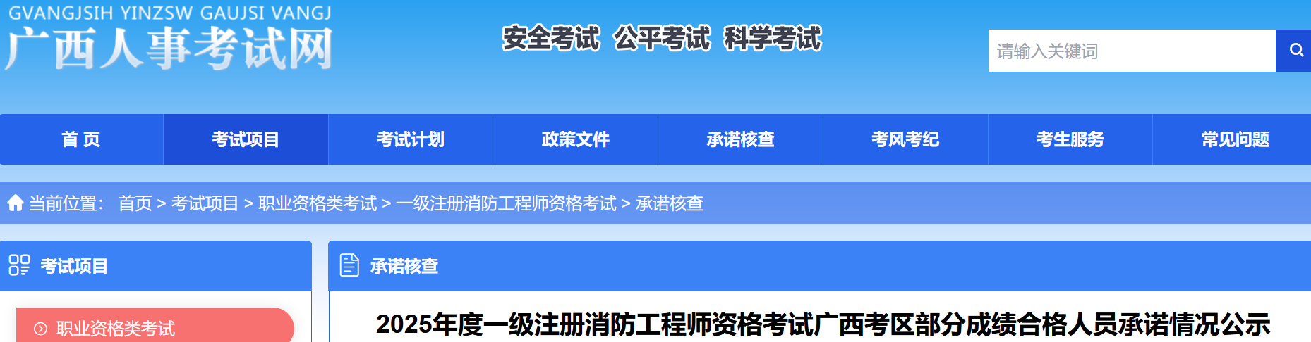 2025年度一级注册消防工程师资格考试广西考区部分成绩合格人员承诺情况公示