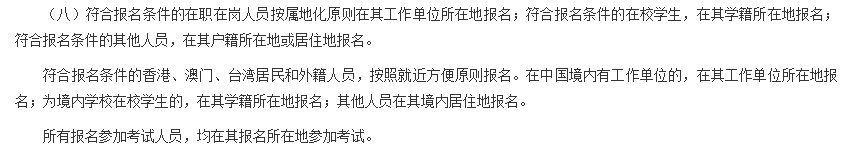 符合报名条件的香港、澳门、台湾居民和外籍人员,按照就近方便原则报名。在中国境内有工作单位的,在其工作单位所在地报名;为境内学校在校学生的,在其学籍所在地报名;其他人员在其境内居住地报名。
