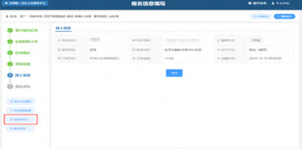 等待审核通过后,重新选择考试会直接进入到网上缴费的页面。页面展示考生报名基本信息、订单基本信息、支付平台以及缴费状态信息。如下图所示: